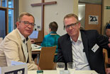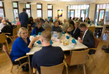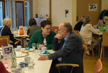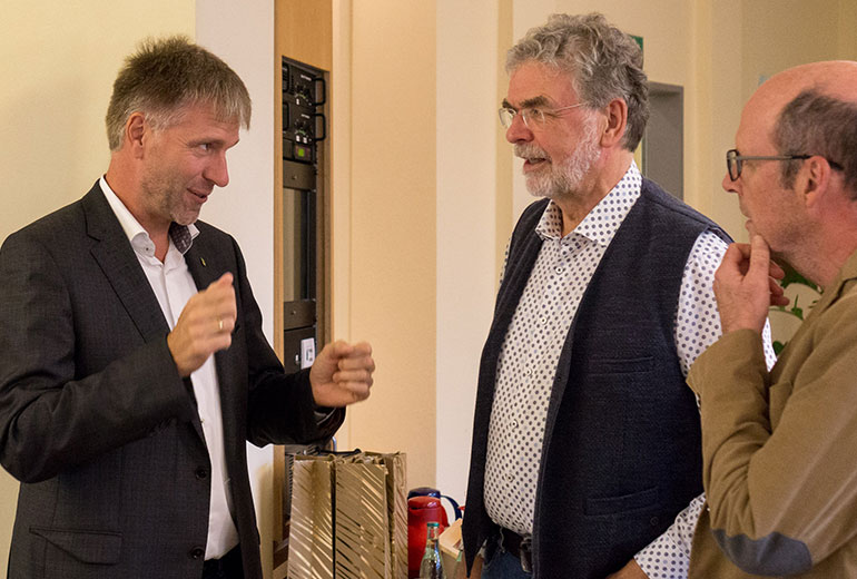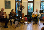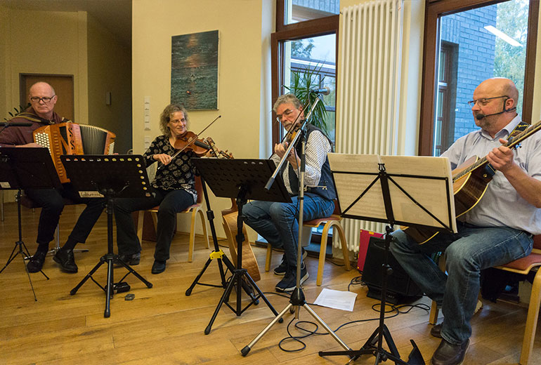 Bei Kaffee und Kuchen kamen die geladenen Gäste untereinander anschließend näher ins Gespräch und nutzten die Gelegenheit, sich auszutauschen. Für die musikalische Untermalung sorgte dabei eine von FWZ-Vorstandsmitglied Reinhold Leusing zusammengestellte, international besetzte „Band ohne Namen“: Die im Orkest van het Oosten engagierte Violinistin Dorothea Mertin, der aus Enschede stammende Akkordeonspieler Nico-Jan Beckers und der in der Steinfurter Volker-Leiss-Band aktive Sänger und Gitarrist Thomas Krause unterhielten neben Leusing selbst (Violine und Gitarre) mit einem bunten Mix aus Musette, Folk und Bossa und erhielten für ihre kurzweiligen Vorträge reichlich Applaus.