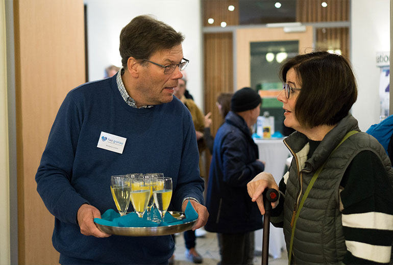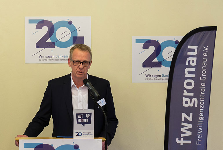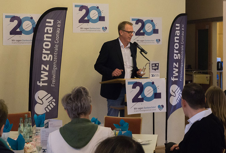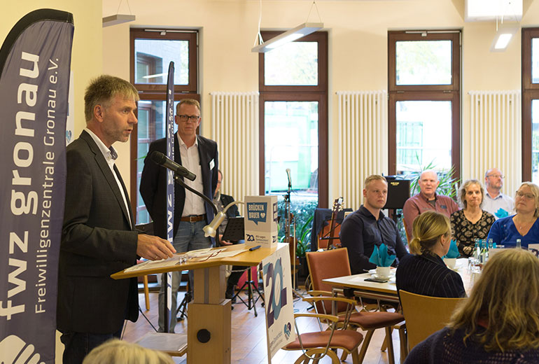Nach einem Sektempfang begrüßte der FWZ-Vorsitzende Andreas Veltman alle Anwesenden, darunter mit Theo Bockholt und Heinz Runte auch zwei ehemalige Vorsitzende der FWZ Gronau, bevor er das Wort zunächst an Bürgermeister Rainer Doetkotte übergab. Doetkotte freute sich feststellen zu können, dass in Gronau und Epe in vielfältigen Bereichen vom Vereinswesen bis in das soziale Umfeld ein starkes Ehrenamtsengagement existiert. Einen starken Beitrag dazu leisteten die Freiwilligenzentrale und die Freiwilligen, die über sie vermittelt und betreut werden: „Die investieren Zeit, Wissen und Empathie in das Gemeinwesen, vielen Dank dafür“, so der Bürgermeister in seiner Rede. Das Wirken der Freiwilligenzentrale sei laut Doetkotte ein „unverzichtbarer Bestandteil des Gemeinwesens und Brückenbau zwischen Generationen und Kulturen“.