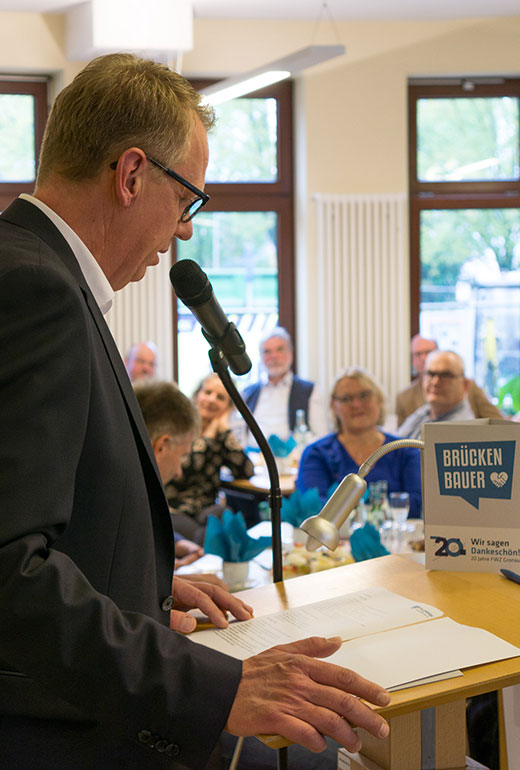 Der FWZ-Vorsitzende Andreas Veltman übernahm anschließend das Wort und nutzte in seiner Rede die Gelegenheit, auf zwei Jahrzehnte Vereinstätigkeit zurückzublicken sowie aktuelle Projekte vorzustellen. Großen Dank sprach er dabei den durch die FWZ vermittelten ehrenamtlich Engagierten aus, von denen auch viele zur Feierstunde gekommen waren. „Ohne Euch wäre die Freiwilligenzentrale ohne Bedeutung“ lobte Veltman die vielfältig Engagierten in den über 30 Mitgliedsorganisationen. Auch bedankte er sich in diesem Zusammenhang bei der Ehrenamtskoordinatorin Maria Leusing, die als Angestellte in der Geschäftsstelle an der Konrad-Adenauer-Straße 45 während der vergangenen Jahre nicht nur Personen ins Ehrenamt vermittelt, sondern zudem vielfach über diese eigentliche Kernaufgabe hinaus tätig war – etwa, wenn es um Geflüchtete oder soziale Fragen allgemein ging.